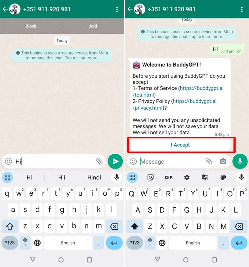 Luego serás redirigido a WhatsApp, aquí responde con “Hola” en el chat y luego acepta sus términos. Seleccione el idioma y toque “Enviar”. Eso es todo.