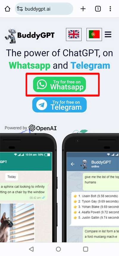 Para integrar BuddyGPT con WhatsApp, vaya al sitio web de BuddyGPT. Selecciona “Pruébalo gratis en WhatsApp”.